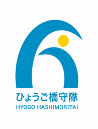 | 『ひょうご橋守隊』のロゴマークは、活動拠点である兵庫県の頭文字(h)を橋に見立てて、その橋の下から人が目視点検する様子を表しています。カラーには兵庫県をイメージさせるセルリアンブルーに、ヘルメットをイメージしたイエローを使用しています。 |