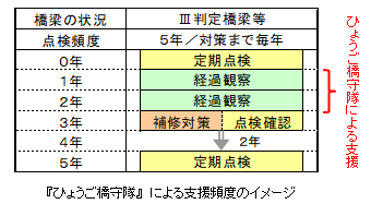 そこで、『ひょうご橋守隊』を派遣し、損傷状況の経過観察を無償で代行することにより、市町が管理する橋梁の適切な維持管理を支援しています。