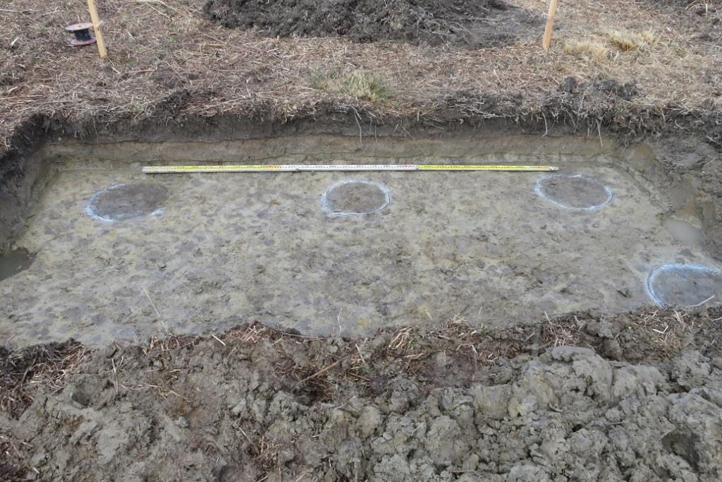 | 発掘成果 | 八家川右岸の低地部で、2×4mのトレンチを24箇所設定し確認調査を行っています。調査区北側では古代の柱穴、掘立柱建物跡、溝を検出しました。調査区南側では、2面の遺構面を検出しました。1面目からは中世と考えられる溝、柱穴を、2面目からは、古代の柱穴を検出しました。また、全ての調査区から須恵器、土師器が出土しています。 |