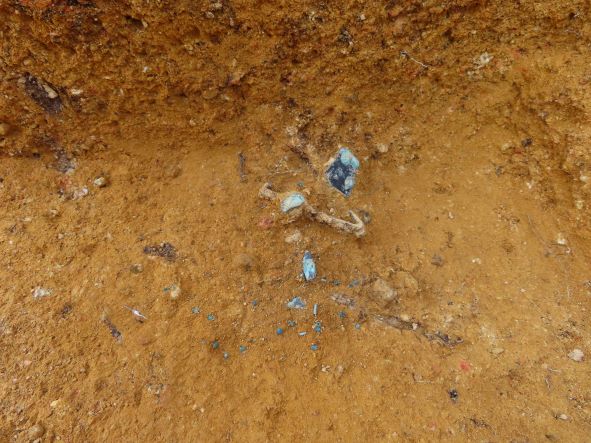 | 発掘成果 | 岸田川西岸の丘陵尾根線上に立地します。弥生時代後期後葉、弥生時代終末期~古墳時代初頭、古墳時代後期の墳墓・古墳6基と、それに伴う埋葬施設22基を調査しました。弥生土器・須恵器・土師器、青銅鏡、鉄製品、玉類などの遺物が出土しています。 |