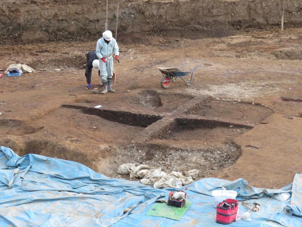 現在調査を行っているD地区は、今年度前半で調査したC地区の北側に位置します。流路跡と竪穴住居跡と想定される遺構を確認し、現在調査中です。出土遺物や建物の形から、流路は中世、竪穴住居跡は弥生時代末頃と考えられます。