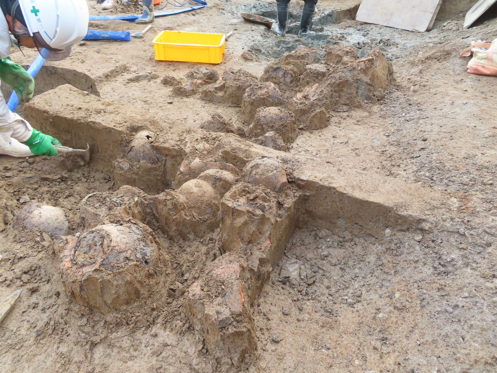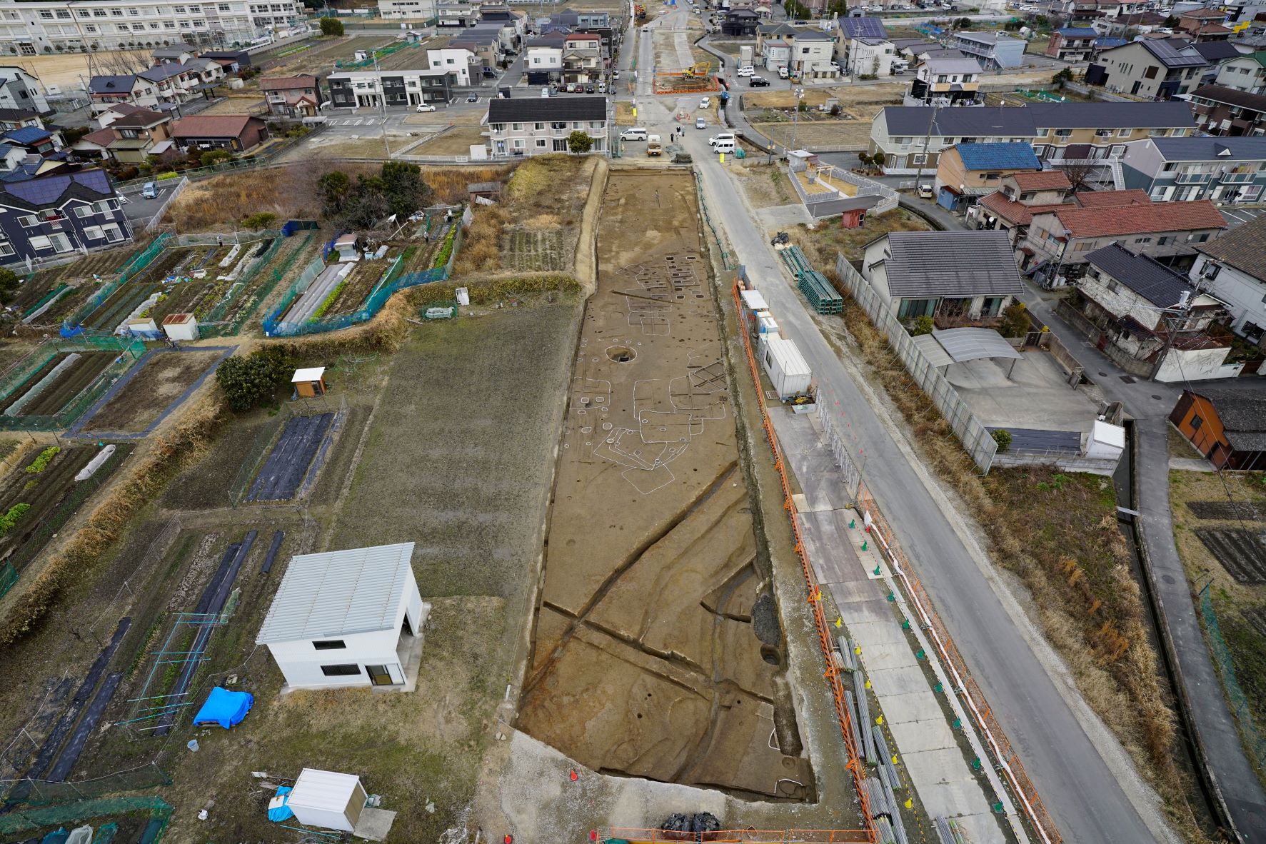 | 発掘成果 | 夢前川右岸の沖積地に立地する遺跡です。 2月中旬に才村遺跡2区と3区の全景写真撮影と空測を行いました。調査の結果、才村遺跡3区では古墳時代の竪穴建物跡が計22棟見つかりました。調査は3月3日に終了しました。 |